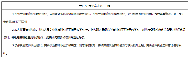 5.全面提升监管队伍专业素质。实施专业素质提升工程,大力开展专业能力教育培训,有计划地开展各级负责药品监管的部门负责人领导能力培训。加强全国药品监管队伍专业化建设,严把入口关,稳步提升监管队伍专业化水平。