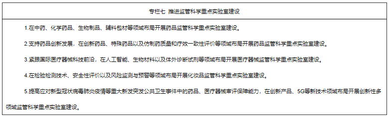 6.深入实施中国药品监管科学行动计划。统筹推进监管科学研究基地和重点实验室建设,开展监管科学等研究。将药品监管科学研究纳入国家相关科技计划,重点支持中药、疫苗、基因药物、细胞药物、人工智能医疗器械、医疗器械新材料、化妆品新原料等领域的监管科学研究,加快新产品研发上市。支持国家审评、检验、评价、核查等机构参与国家相关科技项目,鼓励开展药品快速检测新技术、药品研发生产及质量控制等研究,开展数字诊疗装备、个体化诊疗产品、生物医用材料的质量评价、检测技术及检测规范等研究,开展化学药品、疫苗、新型药物和特殊药物剂型等安全性、有效性评价技术以及创新医疗器械标准体系研究。鼓励运用现代科学技术,结合我国传统优势项目和特色植物资源,加强化妆品新原料研究。
