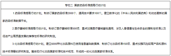 1.持续推进标准体系建设。继续开展国家药品标准提高行动计划。编制2025年版《中华人民共和国药典》。加强标准的国际协调,牵头中药国际标准制定,化学药品标准达到国际先进水平,生物制品标准与国际水平保持同步,药用辅料和药包材标准紧跟国际标准。加强药品标准技术支撑体系建设,提升药品标准研究能力。优化医疗器械标准体系,鼓励新兴技术领域推荐性标准制定,加快与国际标准同步立项,提升国内外标准一致性。完善化妆品标准技术支撑体系,健全标准制修订工作机制。