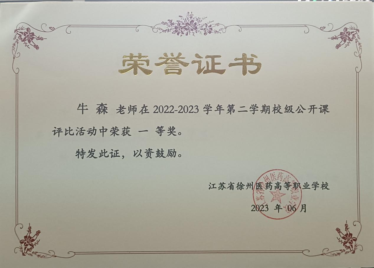 2023年3月30日本工作室牛森老师举行了本学期校级公开课《注射剂概述》。经过学校和系部督导的评选,最终牛森老师的作品获得本学期公开课评比一等奖。