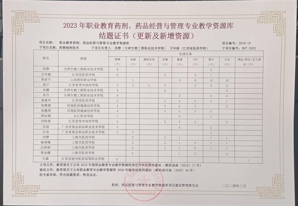大会总结了2023年度教学资源库项目建设工作,遴选了42个资源库应用典型案例,评选出优秀典型案例12个,表彰了资源更新、典型案例、优秀应用推广等课程资源,我校牵头建设的《药品仓储与配送》课程获表彰。本工作室负责人牛森老师参与的教育部课题《职业教育药剂、药品经营与管理专业教学资源库》完成新一轮更新工作,完成年度结题工作。我校张福玲、许子珊2位老师获资源库优秀应用教师称号,2个案例被评为典型案例。