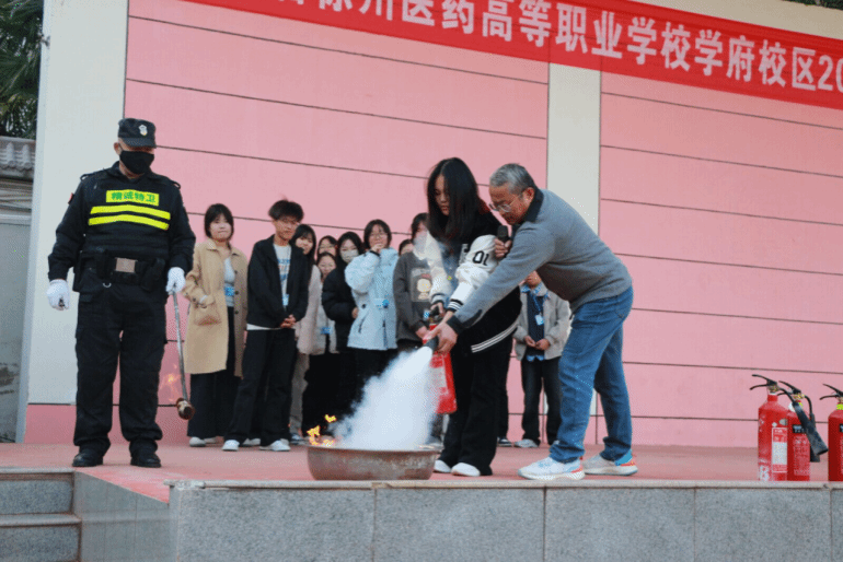 疏散集结后,安全保卫处权启山老师现场演示灭火器的正确操作步骤,详细讲解了“提、拔、握、压”四字诀及安全注意事项。随后,新生代表在专业人员指导下近距离操作灭火器扑灭模拟火源,亲身感受灭火过程。