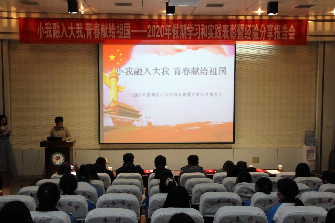 小我融入大我,青春献给祖国。11月25日下午,我校2020年假期学习和实践表彰暨经验分享报告会在阶梯三顺利举行。佟光进副校长、学工处凡华副处长、校团委王秀杰副书记、制药工程系徐亮副主任、护理系杨鑫副主任、护理系钟弦弦老师、药学技术系王清克老师、制药工程系潘元元老师、制药工程系郭庆宇老师、校团委郑欣欣老师、学工处冯金老师及各班级学生代表近100人共同参加。