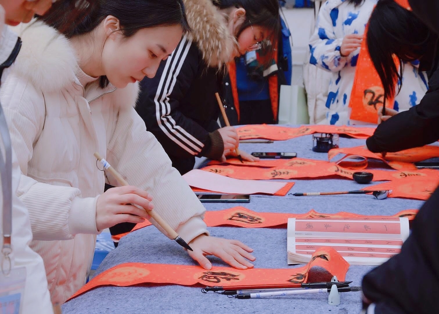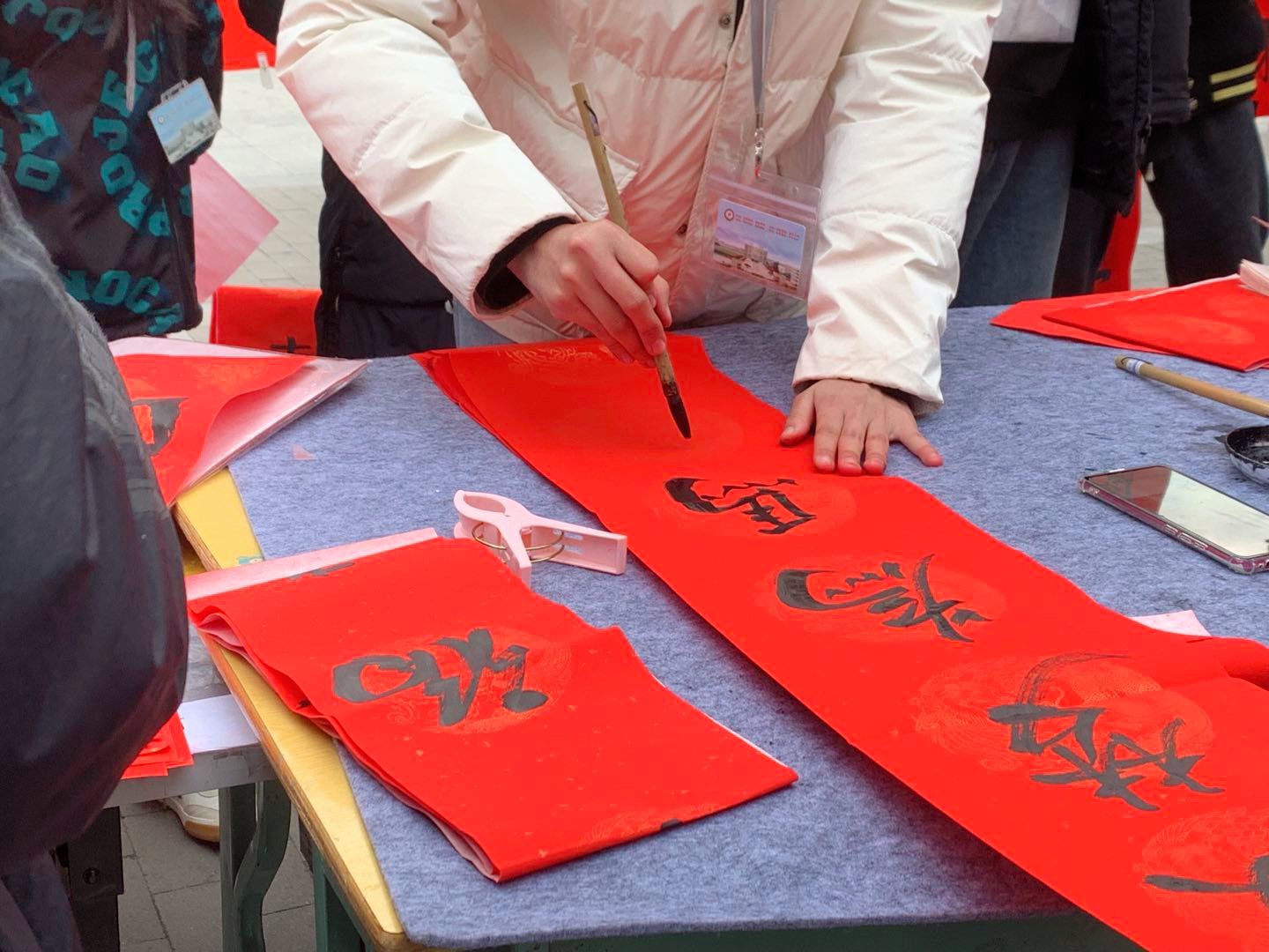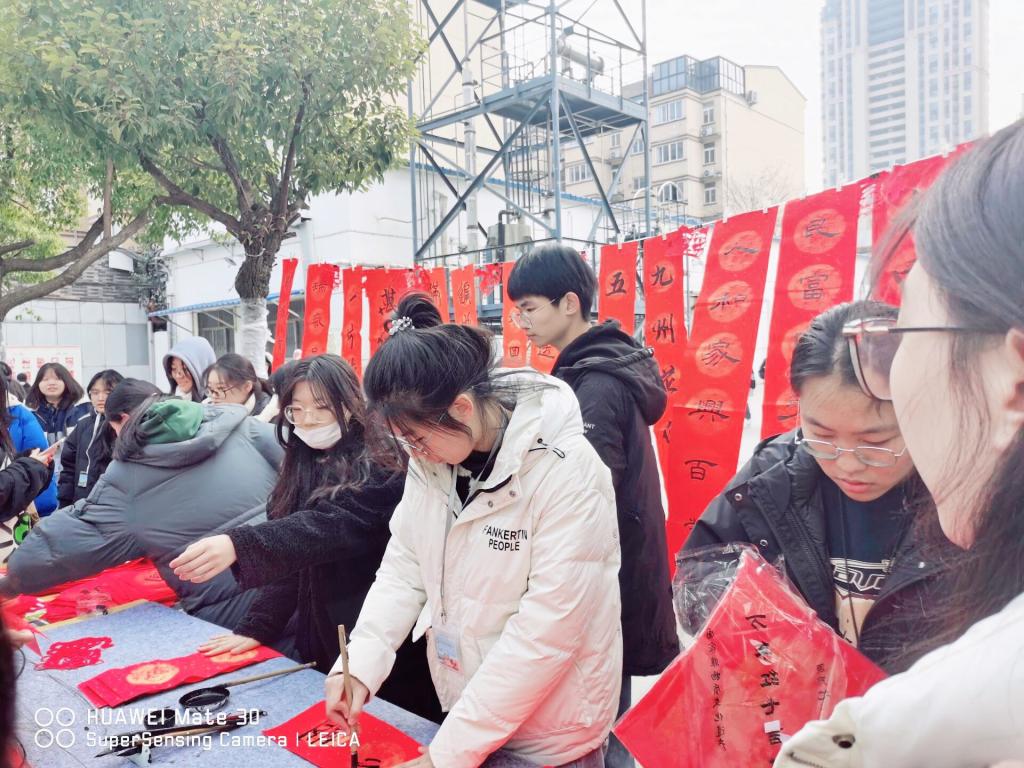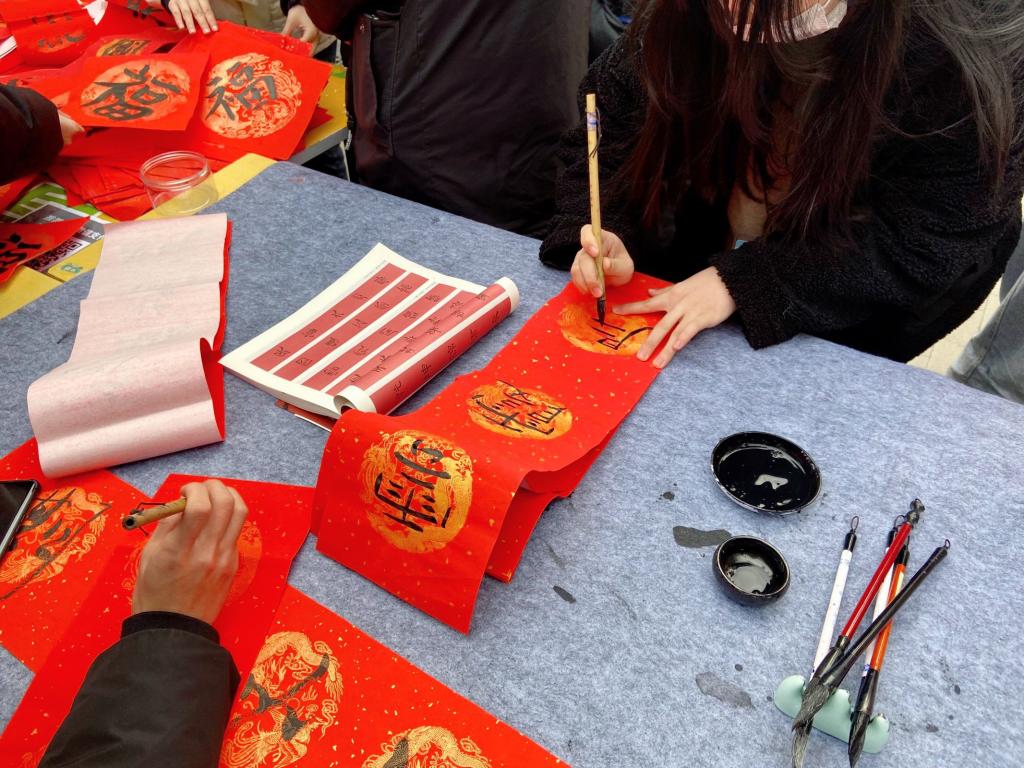 活动现场,书画剪纸协会向全校师生展示了本学期协会成员的优秀作品,协会成员发挥各自所长,现场撰写春联与福字、制作新春窗花,遒劲的书法、精美的窗花受到来往师生的喜爱,有些同学更是跃跃欲试,并现场挥毫,书写出属于自己的春联祝福。