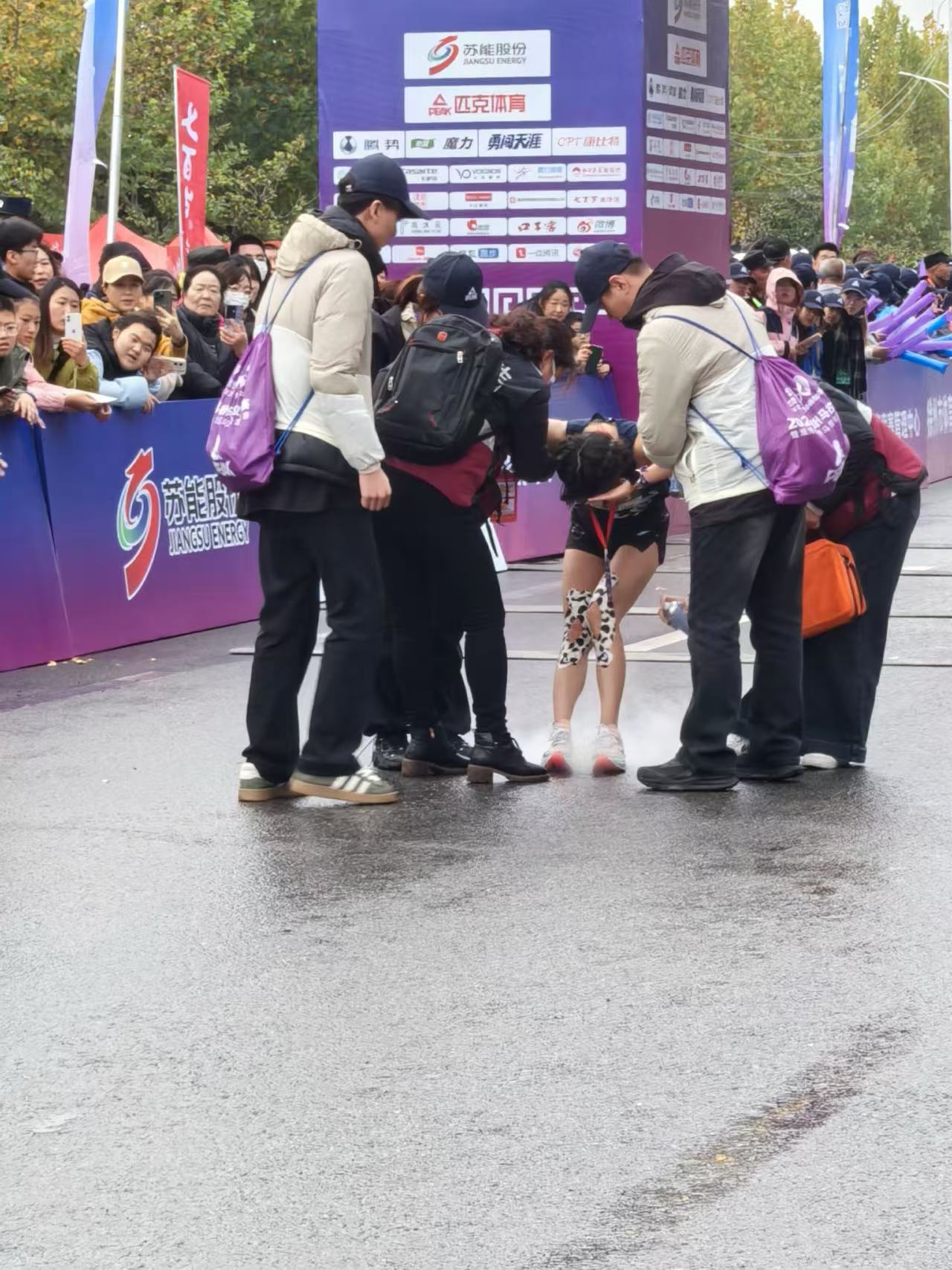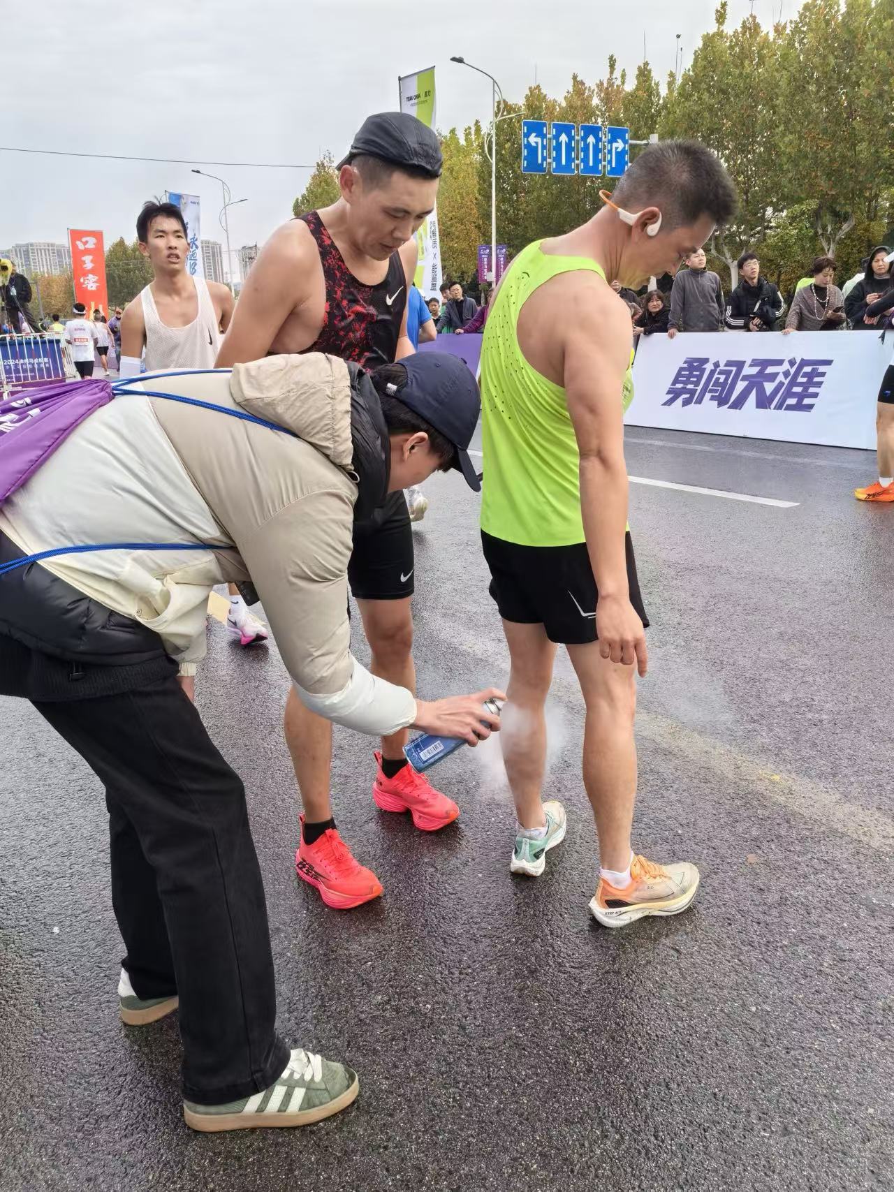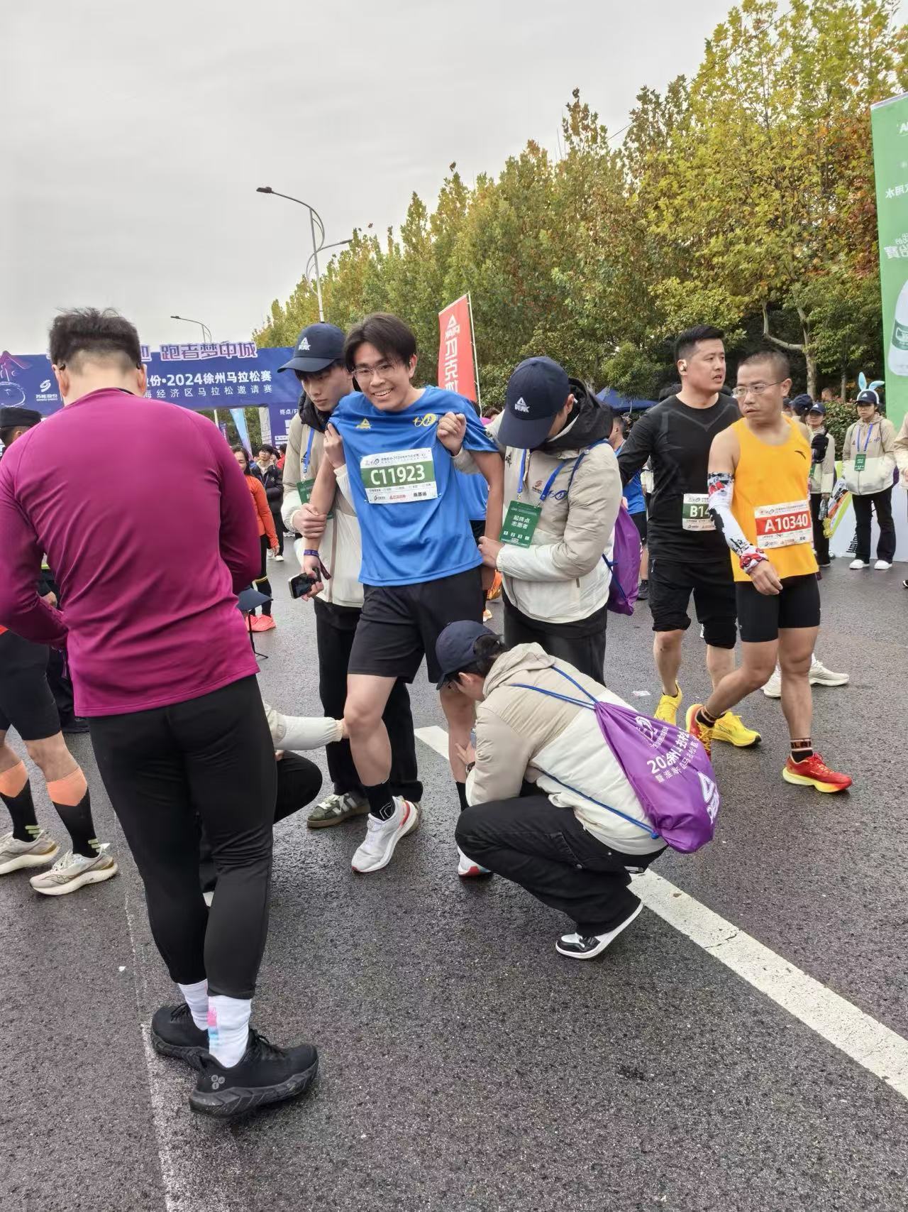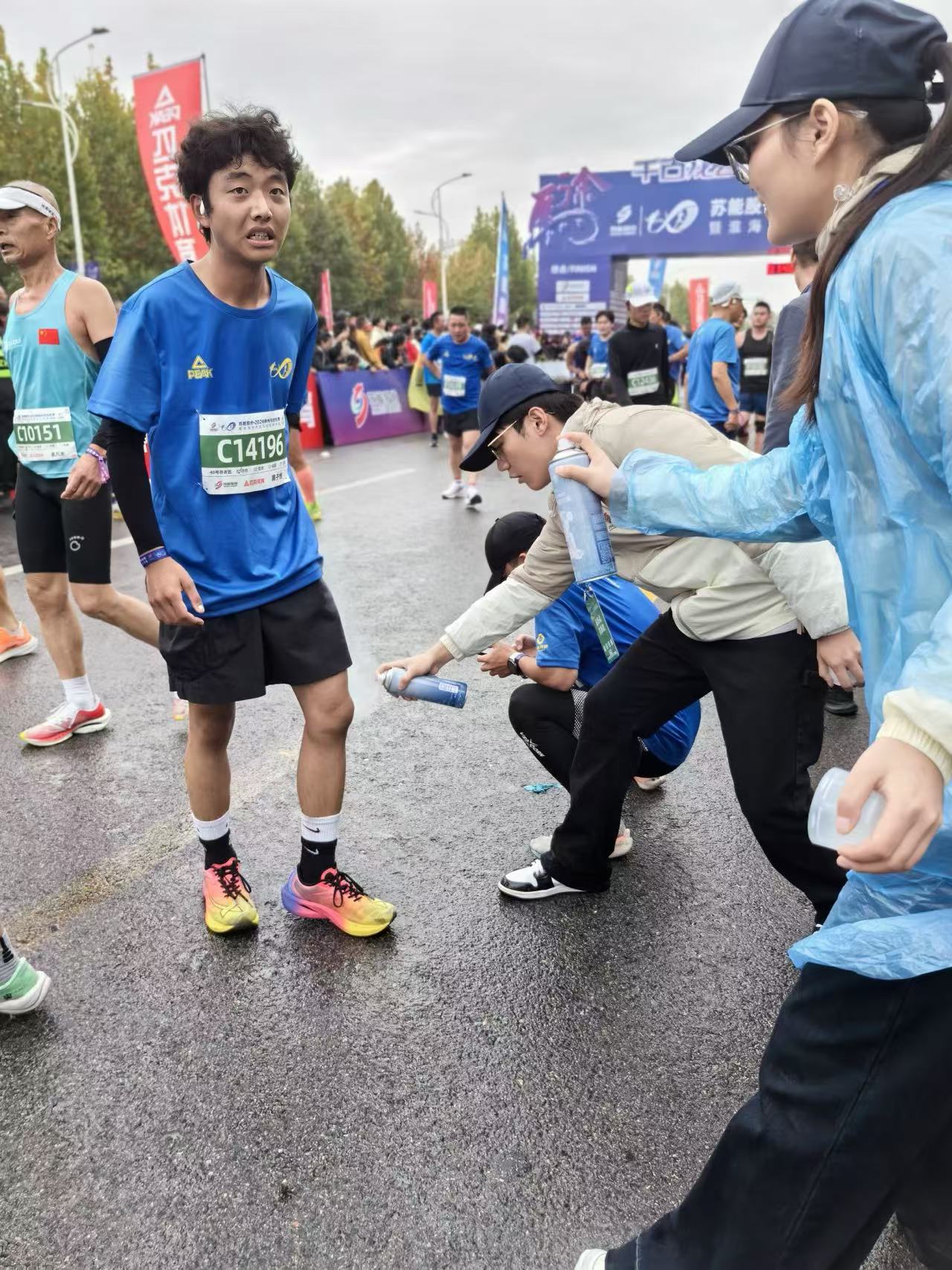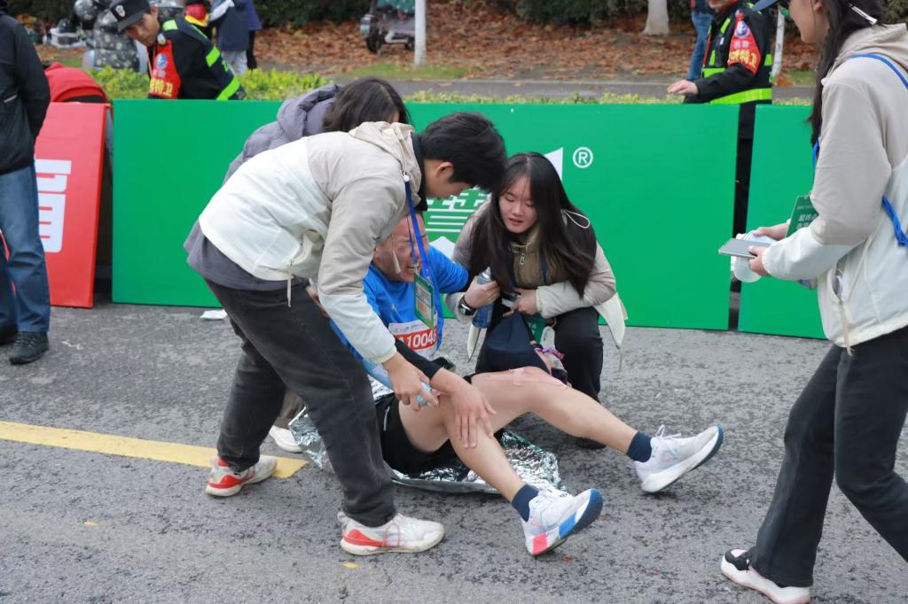 暖心服务,彰显青春担当。11月17日凌晨三点半,志愿者们已在小雨中集结完毕,精神饱满地奔赴各自负责的岗位。比赛开始后,他们分布在马拉松赛道的起点及终点,在专业医生的指导下,实时观察运动员的身体状况,发现问题及时处理。在比赛过程中,有的选手因体力不支行走吃力,志愿者们迅速上前搀扶,用医疗冷喷帮助选手减轻痛苦,并递上补充能量的饮品;当遇到有选手擦伤、扭伤时,志愿者们又立即通知医生对伤口进行消毒、包扎处理,让受伤选手倍感温暖。在长达数小时的赛事中,我校的医疗志愿者们始终坚守岗位,用微笑和耐心为每一位参赛选手送去了帮助与支持,他们的辛勤付出赢得了选手们的纷纷点赞。