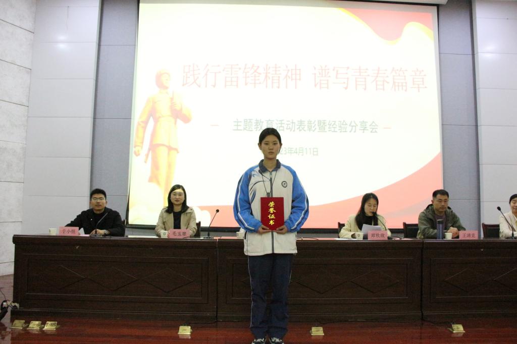 会上表彰了“学雷锋标兵”“最佳黑板报班级”“学雷锋先进班级”“学雷锋先进团总支”等个人和集体。学雷锋先进团总支代表20高护3班党思雨同学、“学雷锋先进班级”代表制药系19高职药物制剂技术1班曹子乐同学、“学雷锋标兵”代表药学系19高职药学2班魏春雪和医疗器械系19高职制药设备应用技术班徐蓓同学向在场师生分享他们在本次活动中的经验和心得。