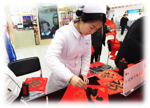 活动期间,社团成员凭借书画技能和专业知识在各个交通站点开展提供引导、送春联福字、健康咨询等活动。在活动现场,成员们各展所长,用娴熟的专业技能和贴心的服务为广大市民普及救护知识、传播健康理念、传递新春祝福。指导老师和社团成员现场写春联、绘福字、展示形式多样的窗花剪纸,现场赠予市民及广大旅客,活动现场墨汁飘香,市民们热情高涨,到处都洋溢着节日的喜庆。“子年春到户,鼠岁喜临门;天增岁月人增寿,春满人间福满门”...一幅幅充满祝福的联语在书法能手的妙笔下熠熠生辉,受到了市委领导和广大市民的围观和称赞,市民及广大旅客纷纷拿出手机拍摄热闹、喜庆的场景,短短2小时,书法老师及同学们书写的100多副春联和福字很快被挑选一空。