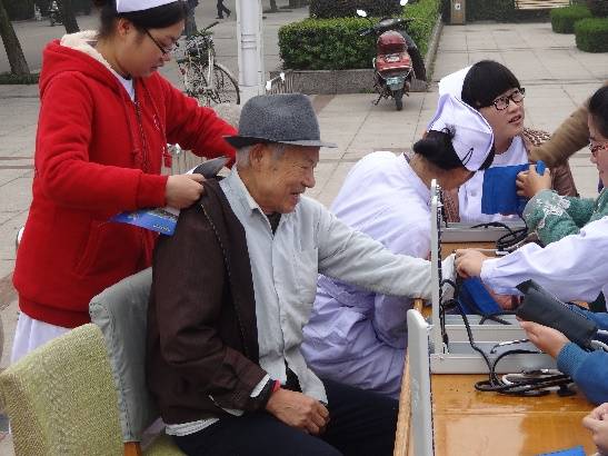 在此之前,大家做了大量的准备工作,包括排练歌舞表演,向负责人员询问地点、安排访问时间等等。爱心诊所社50名成员怀着激动的心情前往恩祥老年公寓。老人们大多是因为子女工作在外比较忙,没时间照顾他们,也有的是无儿无女,孤独一身的生活在这里。落寞的眼神、被岁月碾过的脸庞以及驼掉的脊背让学生们的心不禁揪紧。由于有的老人走路不方便,甚至一直都坐在轮椅上,学生们到房间里小心翼翼的把他们搀扶到院子里,和老人围坐在一起,内心无比温馨感动。同学们用自己所学的护理知识,为老人们量血压、测血糖,进行高血压、糖尿病、冠心病等常见病、多发病防治办法和用药知识的宣传。“哎,真好!足不出户也能感受到社会的爱心。”“这些孩子心地可真让人打心眼儿里喜欢”......其实我们都知道,这些老人缺的不是物质上的资源,而是内心精神上的陪伴。学生们的用心付出,得到老人们的肯定。