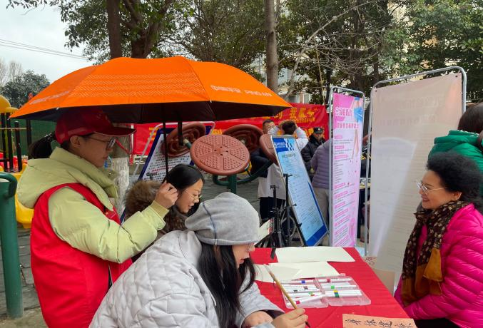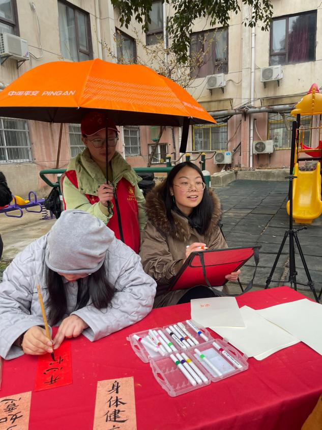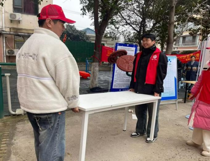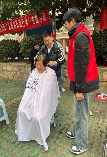 活动前,在社区工作人员和班主任的安排下,志愿者们开始布置场地,虽然天空下着细雨,丝毫不影响志愿者们“我为群众办实事”的火热心情,随着参与活动的居民到来,志愿者们为居民介绍本次活动内容,主要有理发、健康指导、理疗、电车维修、肖像绘画等。志愿者们引导居民有序排队,及时回答居民的提问,展现良好的精神面貌和专业素养。
