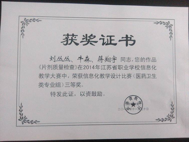 蒋翔宇同志的作品“片剂质量检查”在2014年江苏省职业学校信息化教学大赛中,荣获信息化教学设计比赛(医药类专业组)三等奖