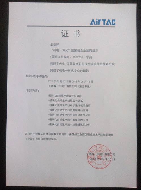 蒋翔宇在2013年6月17日至2013年8月16日在亚德客(中国)有限公司(浙江奉化)培训
