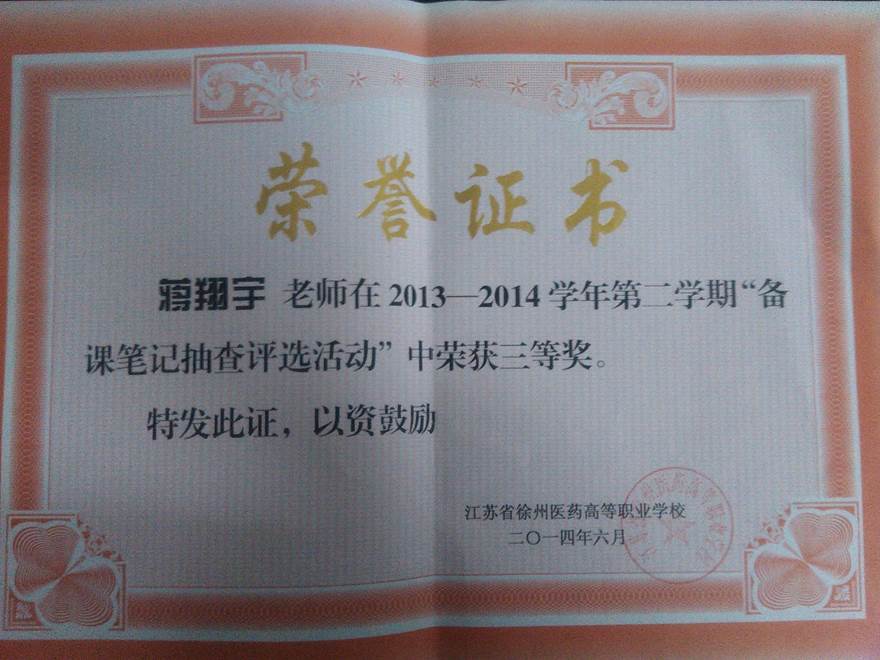 蒋翔宇在2013—2014学年第二学期“备课记抽查评比活动”中荣获三等奖