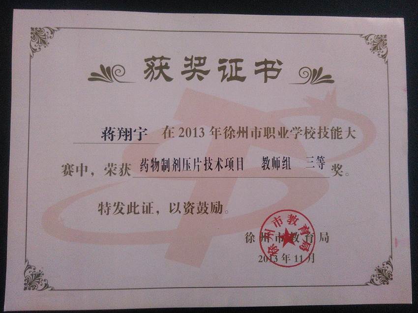 蒋翔宇在2013年徐州市职业学校技能大赛中,荣获药物制剂压片技术项目教师组三等