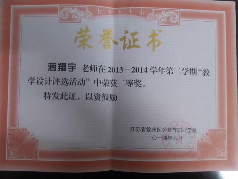 蒋翔宇在2013—2014学年第一学期“优秀教案评比活动”中荣获二等奖
