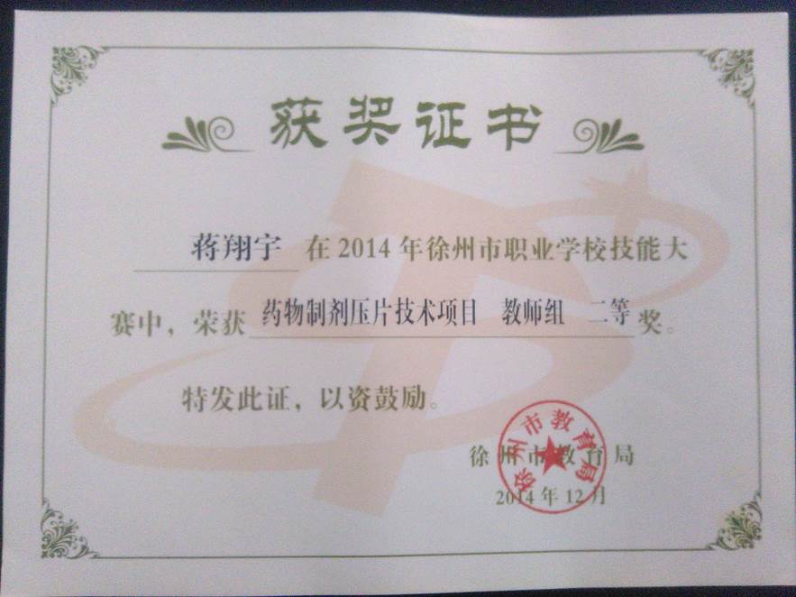 蒋翔宇在2014年徐州市职业学校技能大赛中,荣获药物制剂压片技术项目教师组二等奖