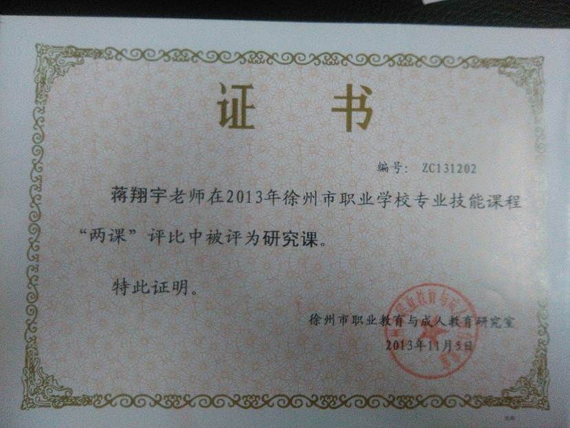 蒋翔宇同志在2013年徐州市职业学校专业技能课程“两课”评为市级研究课