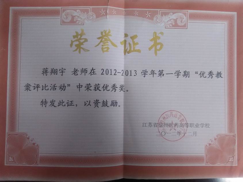蒋翔宇在2012—2013学年第一学期“优秀教案评比活动”中荣获优秀奖