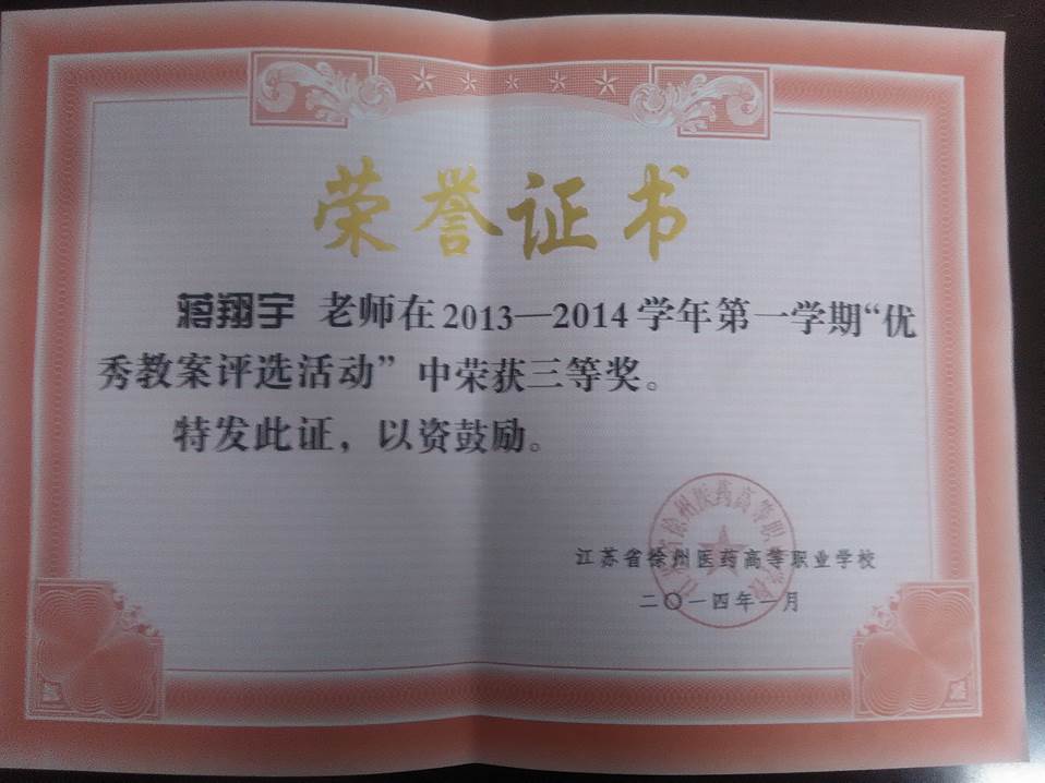 蒋翔宇在2013—2014学年第一学期“优秀教案评比活动”中荣获三等奖