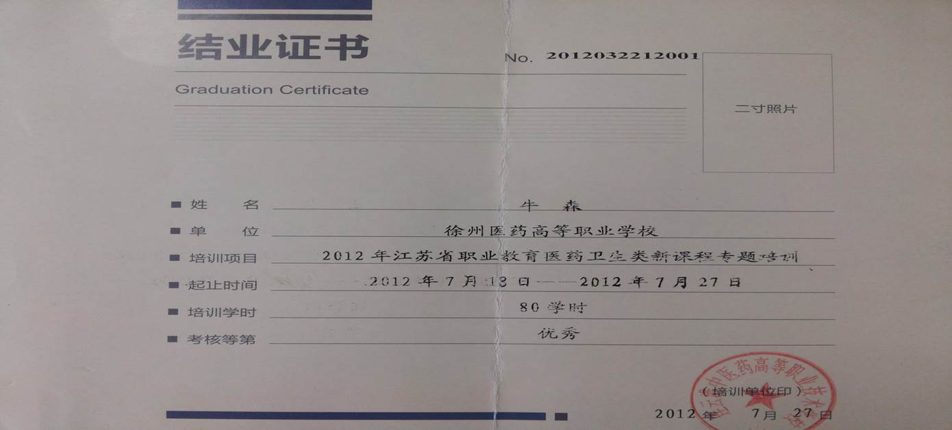 牛森获得江苏省教育医药卫生类新课程专题培训结业证书
