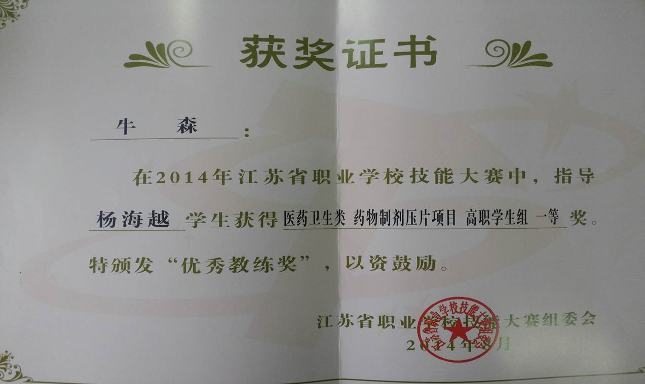 杨海越 10高职制剂 2014年江苏省职业学校药物制剂压片技术技能大赛高职组 一等奖