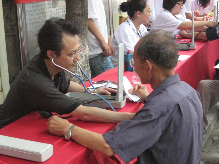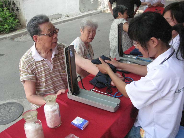 医疗队的到来得到了小区居民的热情欢迎。服务台前很快聚集了前来咨询和检查的群众,大家自觉排队等候。志愿者们分成五组,量血压的缠壁带、架听诊,动作专业而娴熟;测血型的严消毒、细取样,操作专注而规范;同时进行的用药知识指导、疾病预防宣传活动得到了师范大学老教授们的交口称赞;此外,吴宏老师的常见病诊治更是吸引了许多社区居民排起来长长的候诊队伍……