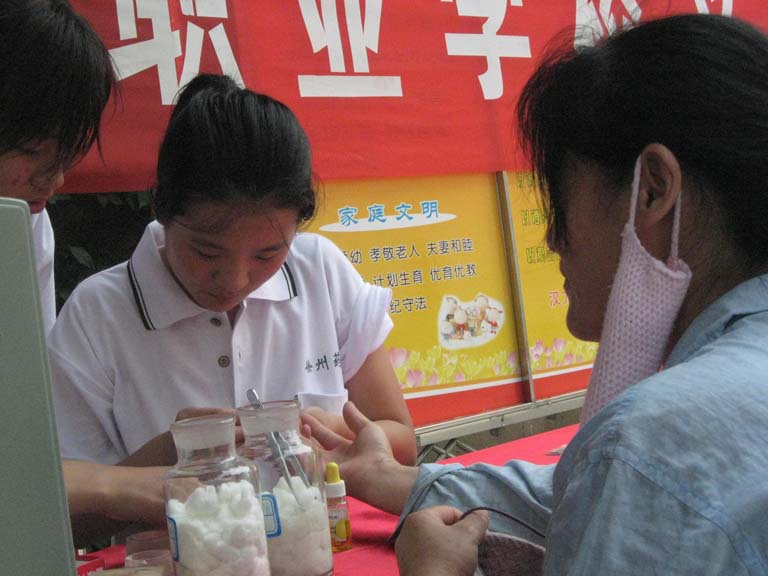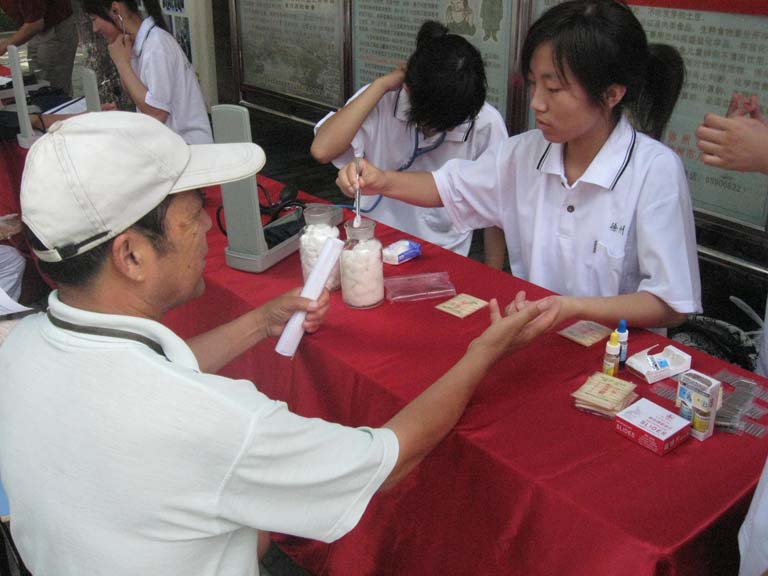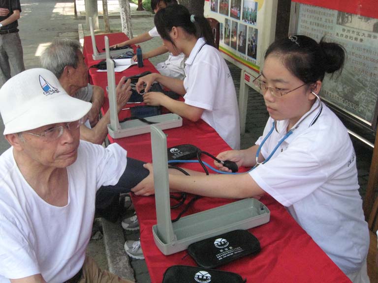 为响应团中央号召,同时为宣传合理用药常识,使学生更好地投身社会实践,在实践中锻炼、检验和充实自己的专业综合能力,并在实践中了解基层群众生活,2008年7月3日,由黄培池、吴宏、孔凡琳等老师带队,徐州医药高等职业学校药学技术系暑期义务医疗服务队一行16人专程来到徐州师范大学教职工小区,进行了为期一天的义务医疗服务。量血压、测血型、常见病诊治、用药知识指导、疾病预防宣传等一系列服务的开展,拉开了我系暑期社会实践活动的序幕。