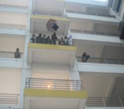 2010年11月23日,我系液体辅导社举办了“第二届鸡蛋碰石头”比赛。活动是将一个由参赛同学自己动手制作的包含一颗生鸡蛋的装置从15米高台扔下,使其自由下落。在鸡蛋不碎的前提下,从结构原理、体积、外观等几方面由专业老师和学生会干部组成的裁判组进行综合打分评比。